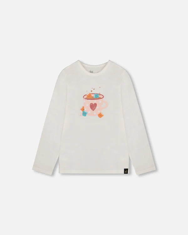 The Organic Cotton Long Sleeve T-Shirt Off-White With Hot Chocolate is a charming and sweet addition to her wardrobe. Made from soft organic cotton with a touch of elastane, this top features long raglan sleeves and a classic round neckline. The playful sweet printed cup of hot chocolate and marshmallows adds a heartwarming touch to this classic piece. Perfect for casual wear, this t-shirt is ideal for pairing with any bottom from our “The Sixties Are Back” collection.
